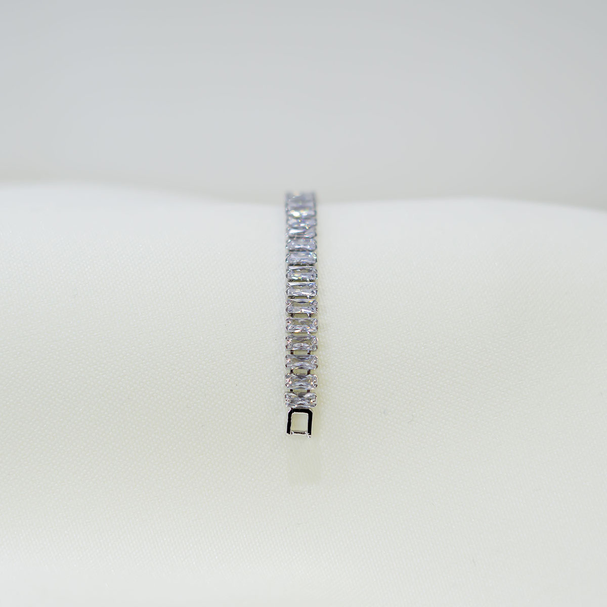 Prachtige zilverkleurige armband met rechthoekige glasstenen erin verwerkt. De armband is van strass en verkleurd niet en is 17 cm lang.